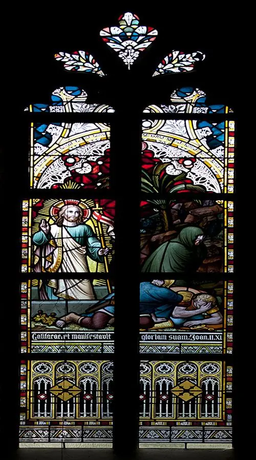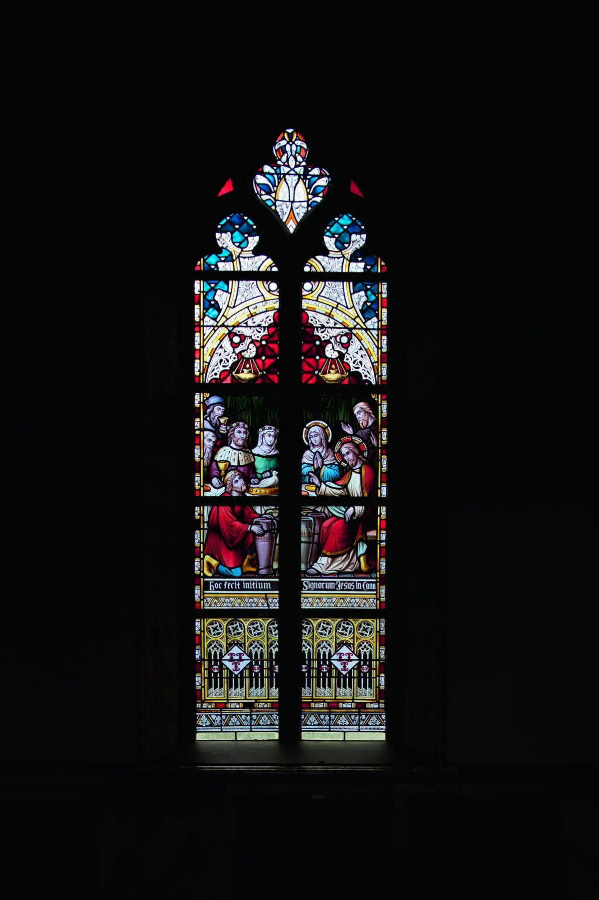 Het eerste wonder dat Christus verrichtte. Hij was, samen met zijn Moeder en discipelen, uitgenodigd op een bruiloftsfeest. Tijdens dit feest raakte de wijn op en Christus liet zes kruiken met water halen. Toen men het water proefde bleek het te zijn veranderd in wijn. Aan tafel zit het bruidspaar met bloemenkransen en hun gasten waaronder rechts Maria en Christus met voor zich de waterkruiken. Onder het raam staat de tekst: “Hoc fecit initium signorum Jesus in Cana”.