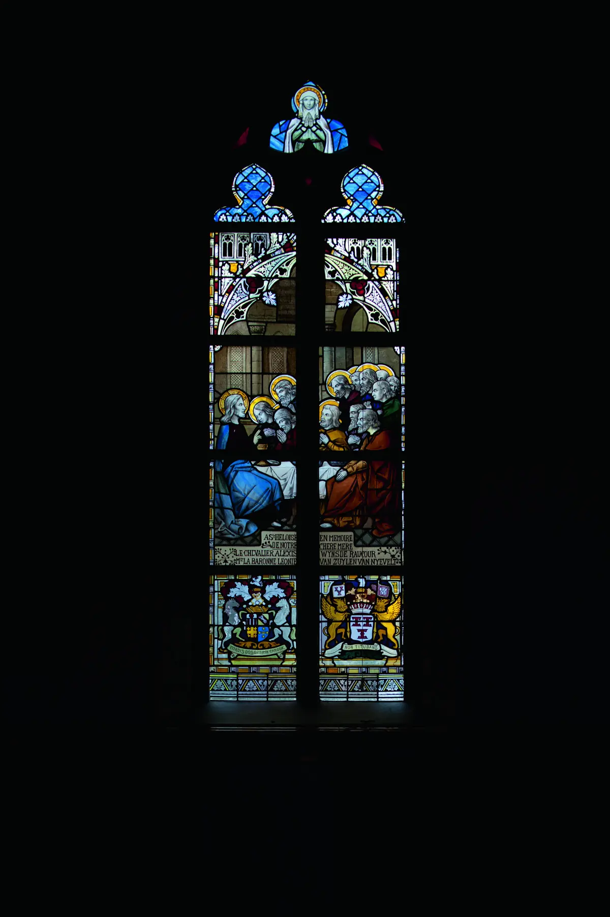 Deze bekende scène laat het Laatste Avondmaal zien dat Christus gebruikte met zijn discipelen. Tijdens deze maaltijd maakt Hij bekend dat Hij verraden zal worden. We zien uiterst rechts tussen de discipelen Judas afgebeeld. Onder dit raam de tekst: “À Heloïse en memoire de notre mère le Chevalier Alexis Wynsde Raucour Mmd La Baronne Léonie van Zuylen van Nijevelt”. Rechts het wapen van Léonie van Zuylen(zuster van Etienne) met “Non Titubans” en links een wapen met vier velden van haar echtgenoot Alexis Wynsde Raucour. Boven dit raam is de heilige Heloïse te zien.
