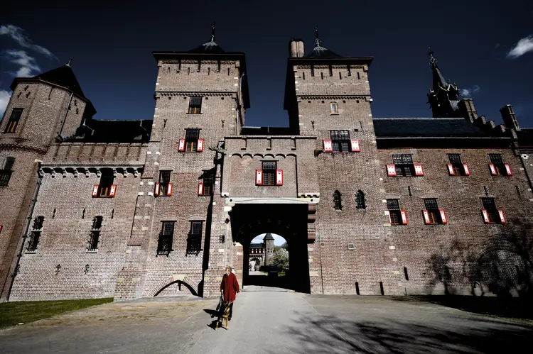 Dit gebouw wordt het Châtelet genoemd, letterlijk ‘klein kasteel’. Het is ontworpen als poortgebouw, waar alle techniek in het kasteel bediend werd. De stoomverwarming, de wateraanvoer, de elektra, alles werd vanuit de kelders van dit gebouw geregeld. Ziet u die torens, in ieder van die torens zitten enorme waterreservoirs van plaatijzer waarin oorspronkelijk het regenwater werd bewaard. In verband met de druk op het leidingwater is het nog steeds van belang dat de reservoirs gevuld zijn.
